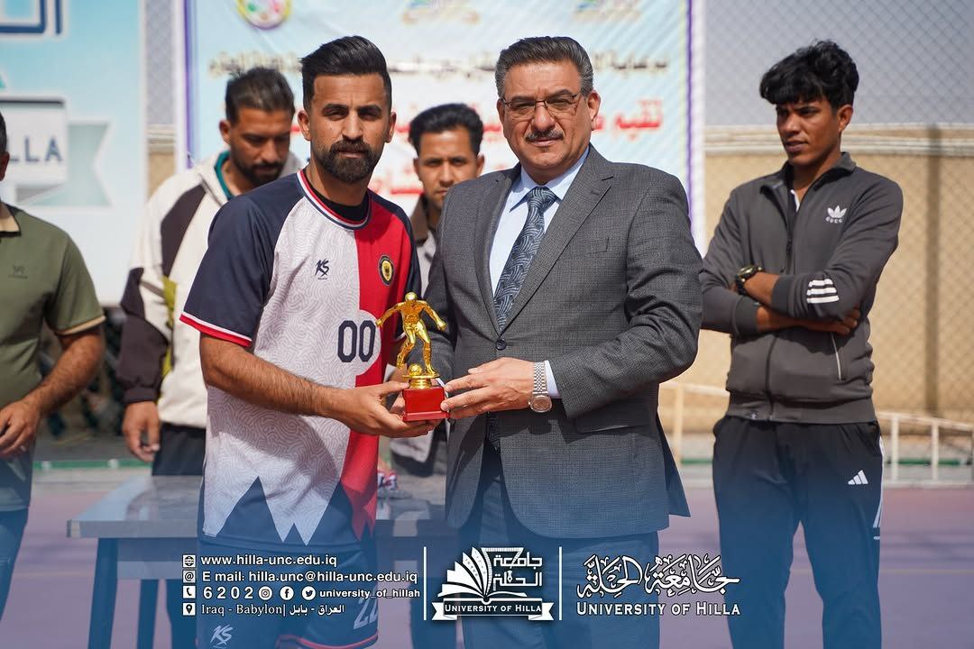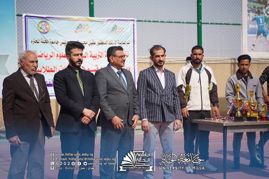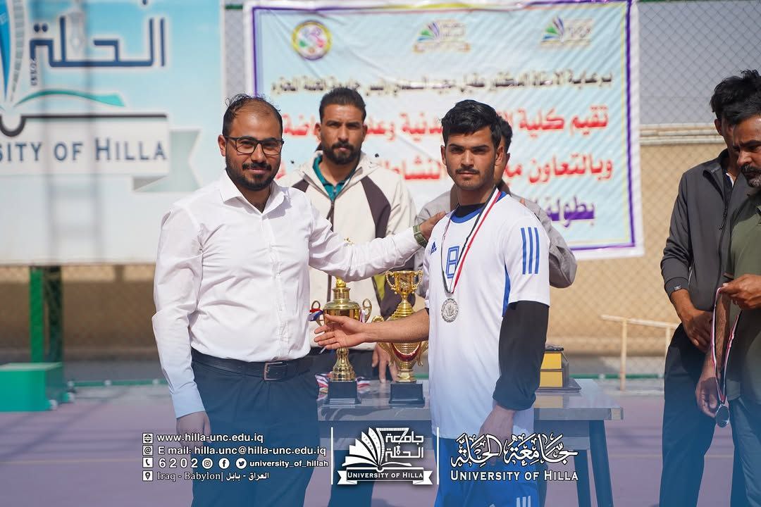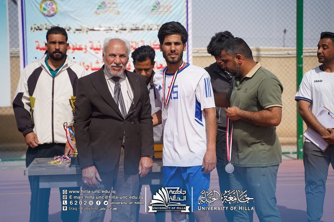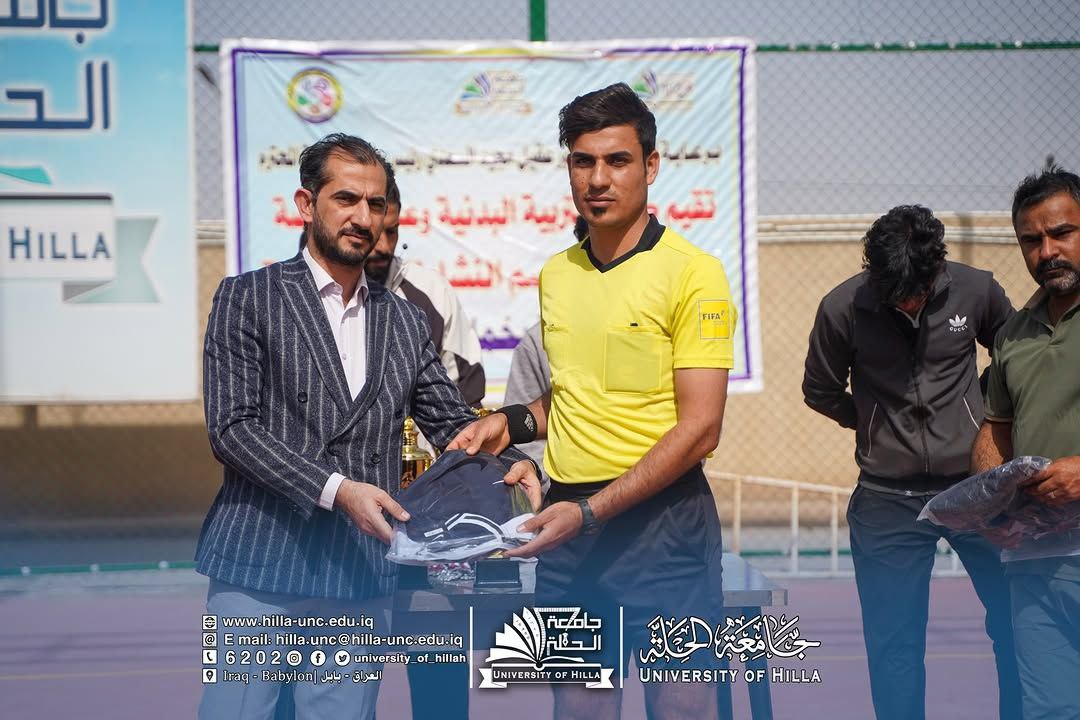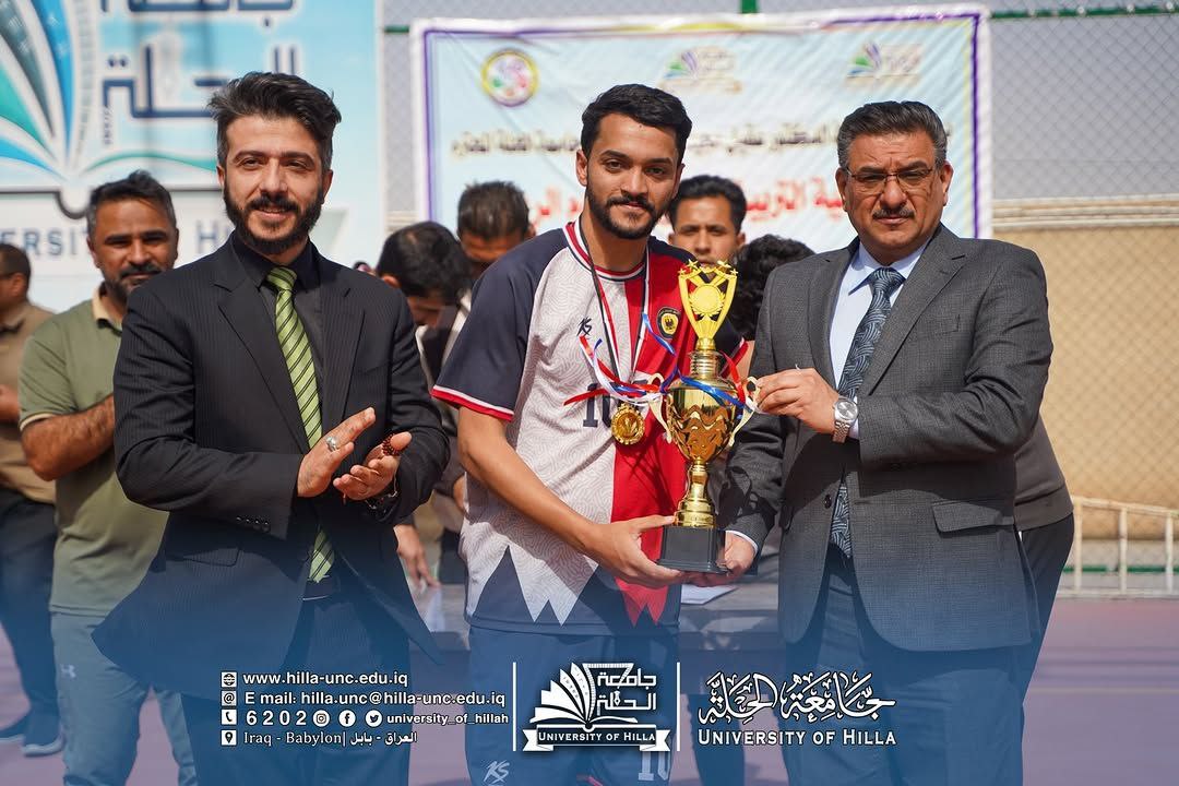 اختتمام بطولة جامعة الحلة للكليات والاقسام العلمية بأجواء رياضية مميزة وحضور أكاديمي رفيع حيث توج فريق كلية التربية البدنية وعلوم الرياضة باللقب بعد فوزه المستحق على قسم الاجهزة الطبية بنتيجة (1-2) في مباراة نهائية مثيرة شهدت تفاعلا جماهيريا واسعا .